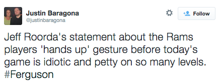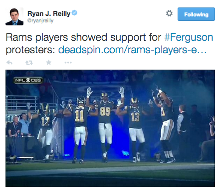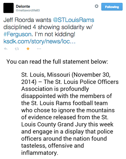 ICYMI in Ferguson (12/1/14): Several St Louis Rams players showed their solidarity with Ferguson protesters as they took the field, displaying the now iconic “Hands Up Don’t Shoot” gesture. The head of the St Louis Police Association, cop killer apologist/defender Jeff Roorda (really, there aren’t enough unpleasant things to say about him), was outraged by the salute, and is calling for the players to be disciplined. The Rams won themselves some new fans today, Roorda be damned! #staywoke #farfromover
