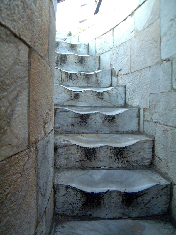 The worn marble steps at the Leaning Tower of Pisa. This is the result of 500 years of walking.