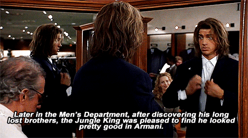 Hell, the whole plot seems to be designed around how damn hot he is! First, for the majority of the film, he wears only a small strip of cloth to cover the dick balls and ass. Everything else is FAIR GAME to drool over for 40 minutes. Then, after he meets Ursula she takes him with her to San Francisco just so we can enjoy him in a well-tailored suit (as seen in the gif set), running around in an open and billowy shirt along side horses while Ursula and all of her friends literally crowd around and make sexual comments about him, and my personal favorite, ditch the loincloth entirely and have him walk around naked while covering his man-bits with various objects while one of Ursula’s very lucky friends oogles him and makes a joke along the lines of “So THAT’S why they call him the ‘KING of the Jungle’…”
