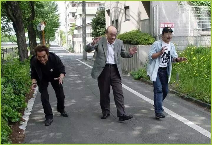 All 3 generations of Godzilla suit wearers walking down the street together