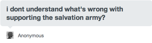 Well, here’s the deal, anon. The Salvation Army is an evangelical Christian group, and they impose those beliefs on the people that they employ and the communities they serve. Here are a few examples: