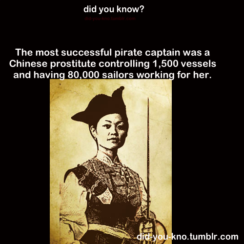 She not only faced them head on, she wiped the floor with them, killing hundreds and capturing sixty-something ships from the Imperial Fleet. Prisoners were given the choice of joining up or being executed on the spot. The Admiral of the Chinese navy, Kwo Lang, was so afraid of being captured by her or going back to admit he’d been beaten by her that he committed suicide.