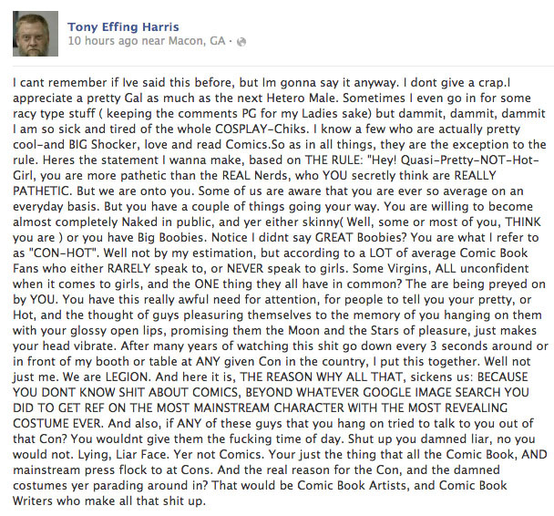 Tony Harris, your remarks are nothing less than disgusting and you ought to be ashamed of yourself. I expect better not just from a professional artist, but for someone who has worked on so many great project before. Simply despicable.