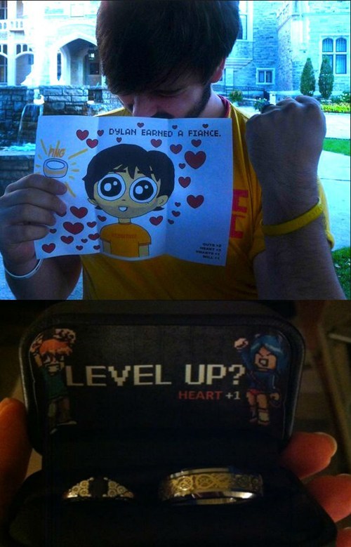 Scott Pilgrim Marriage Proposal of the Day: On a trip to Toronto, lucky boyfriend Dylan was treated to a Scott Pilgrim-themed scavenger hunt, culminating with this marriage proposal from his girlfriend. Well done.