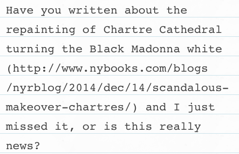 So, someone just dropped this in my inbox, and no, I haven’t written about it but I knew about it. This is the sort of thing that happens, unfortunately. I do have a post about the Black Madonna of Chartres, Our Lady of the Pillar.